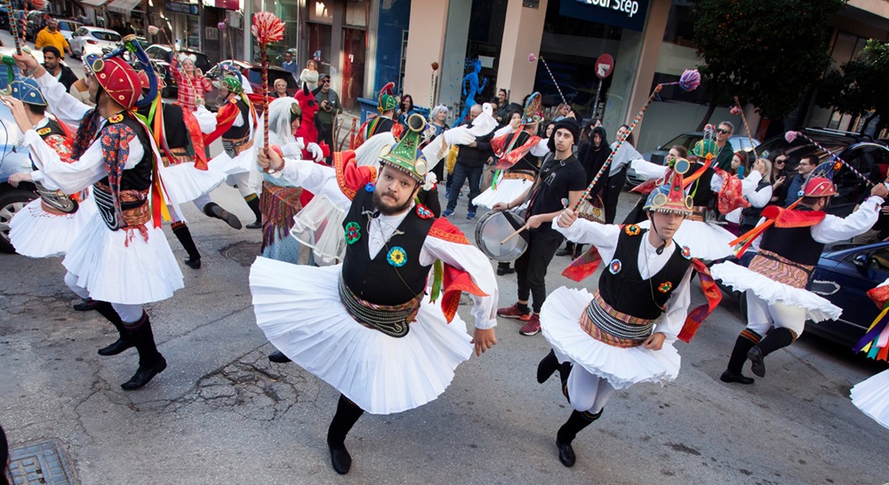 Momoeria perform with dance, music, song and theatre. The Momoeria groups are usually dressed in helmets, multi-pleated white skirts and holding wooden sticks. Among them is a male theatrical group of: two brides, an old man, an old woman, the devil, a bear, a doctor, a policeman and other characters. The group usually consist of approximately 30 people that satirises certain aspects of social life (Hellenic Republic, Ministry of Culture, Education & Religious Affairs 2015).