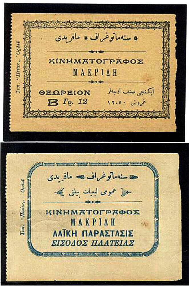 Ordu, cinema tickets. Top: Cinema Makridis. Box B. Row 12. [Κινηματογράφος Μακρίδη. Θεωρειον. Β. Γρ. 12]. Bottom: Cinema Makridis. Folk Show. Entrance: Public Area. [Κινηματογράφος Μακρίδη. Λαϊκή Παράστασις. Είσοδος Πλατείας]. The Makridis cinema began operating in Ordu in 1912.