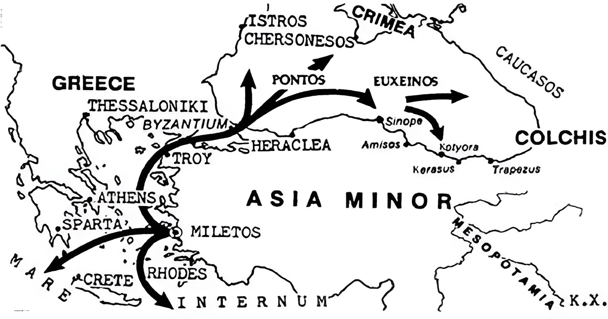 The Milesians (Figure 3) drove out from Sinope the weakened Leucosyrians [also referred to as White Syrians or Kappadocians] after a period of occupation by the Kimmerians. Sinope then conquered land from the natives to the east for her colonists.3
